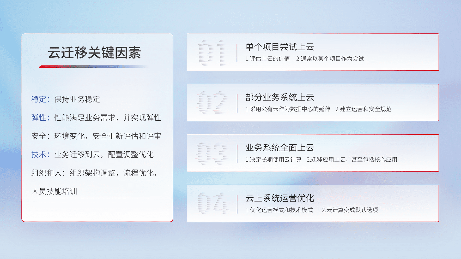 结合实际业务,,从规划设计、、、、云平台选型、、、、云原生改造、、、、数据迁移、、、、集成交付,,迁移全过程为客户识别最佳上云路径,,,做好风险识别管理,,,设计网络架构、、、身份权限、、、、安全审计合规、、、、操作审计、、、、日志审计、、、监控告警策略、、、多站点容灾设计等,,,对云上基础设施进行整体规划,,提升IT治理水平,,以满足弹性、、、、高可用、、、、高性能的需求。。。
