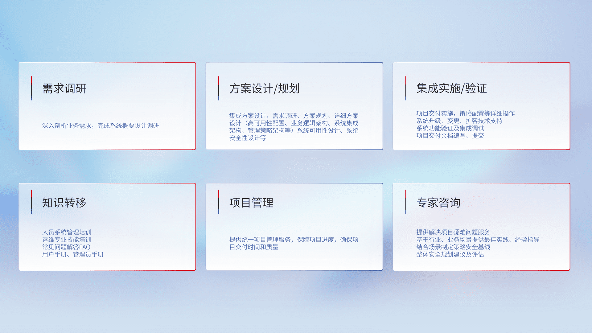 针对客户行业特性,,将宏观的安全战略和需求,,,通过专业的交付服务,,实现项目落地,,为客户提供标准规范的集成交付服务。。。